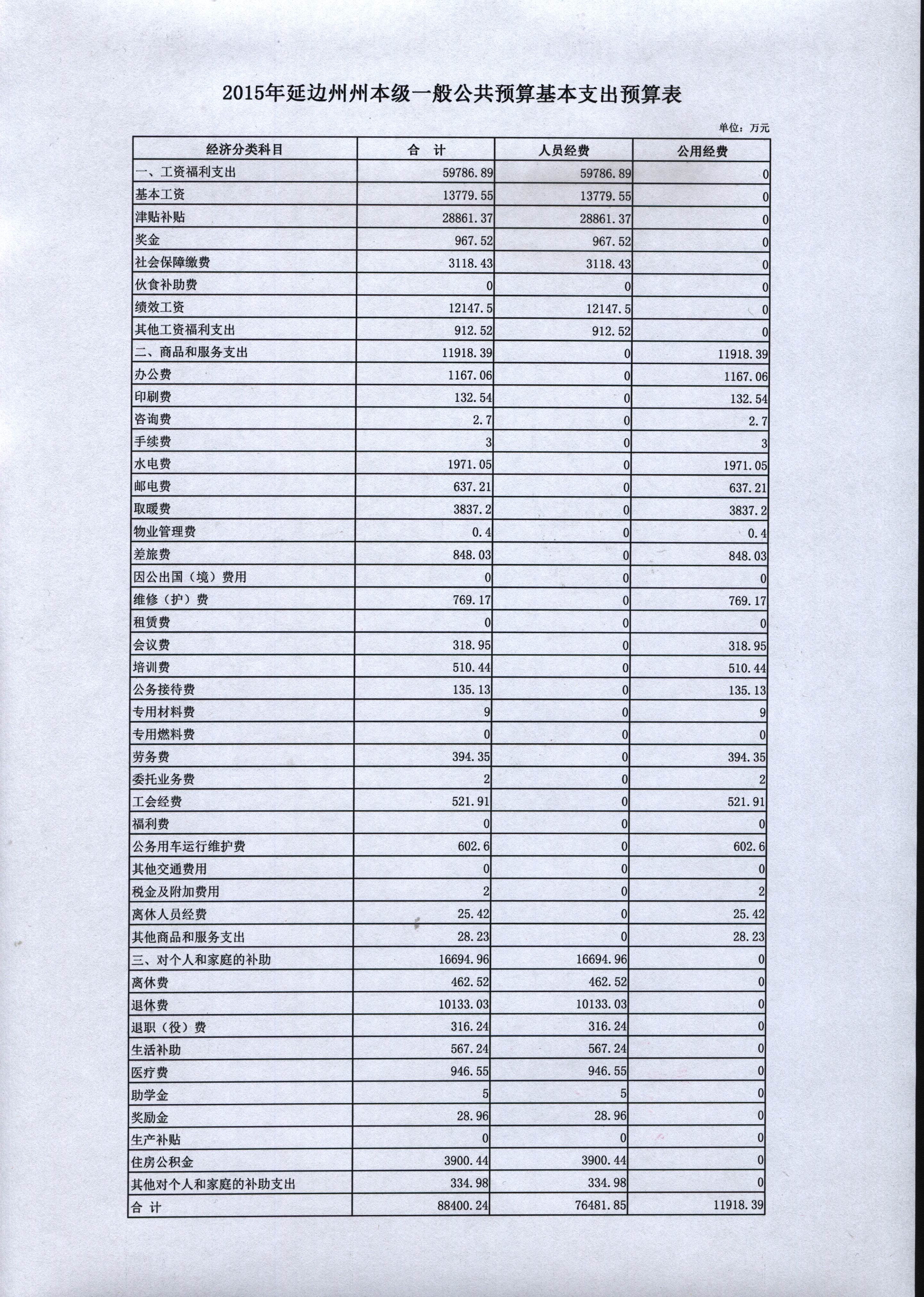 2015年延边州州本级一般公共预算基本支出预算表